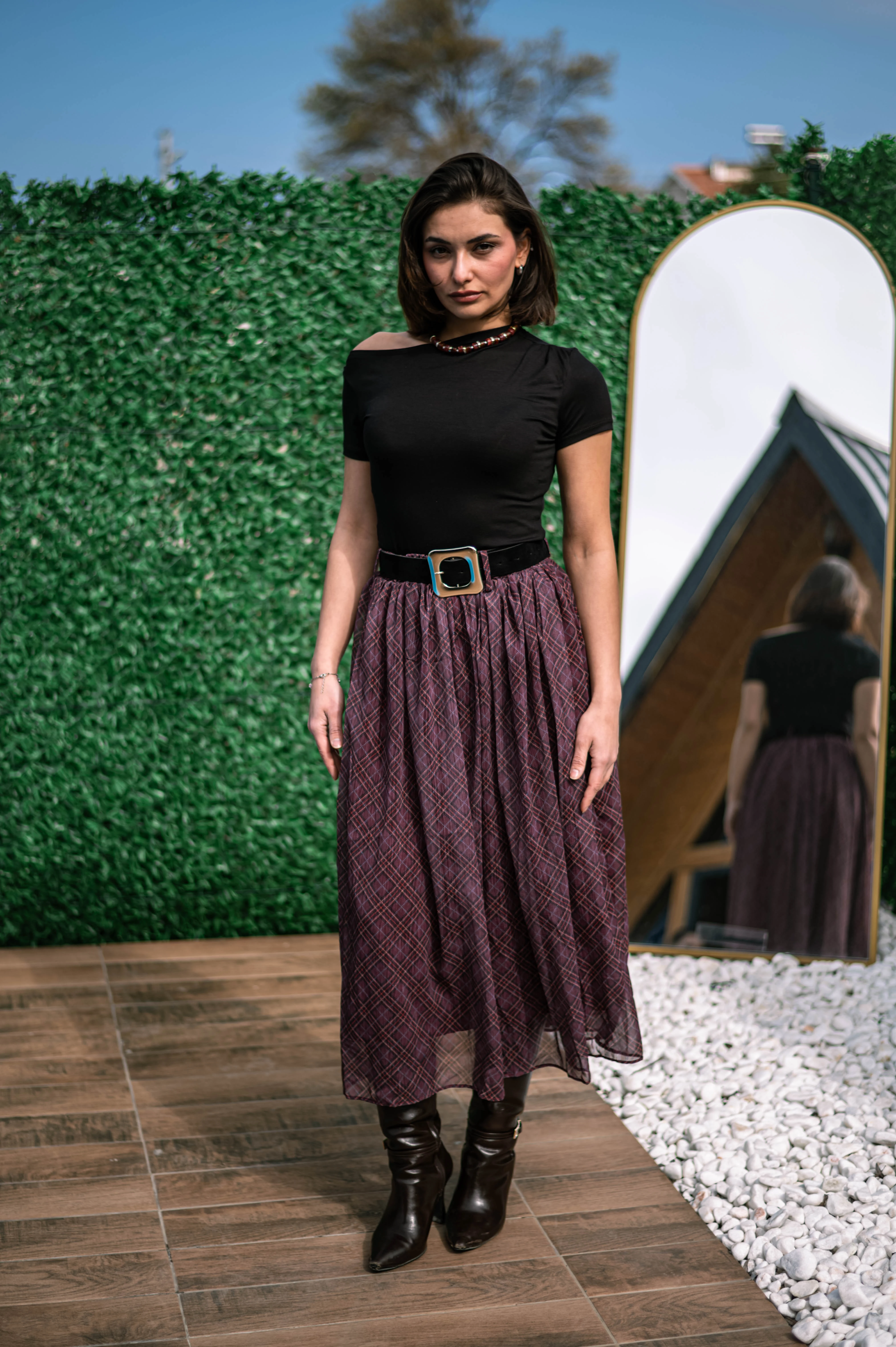 Bordo Kemer Detaylı Pileli Tül Etek