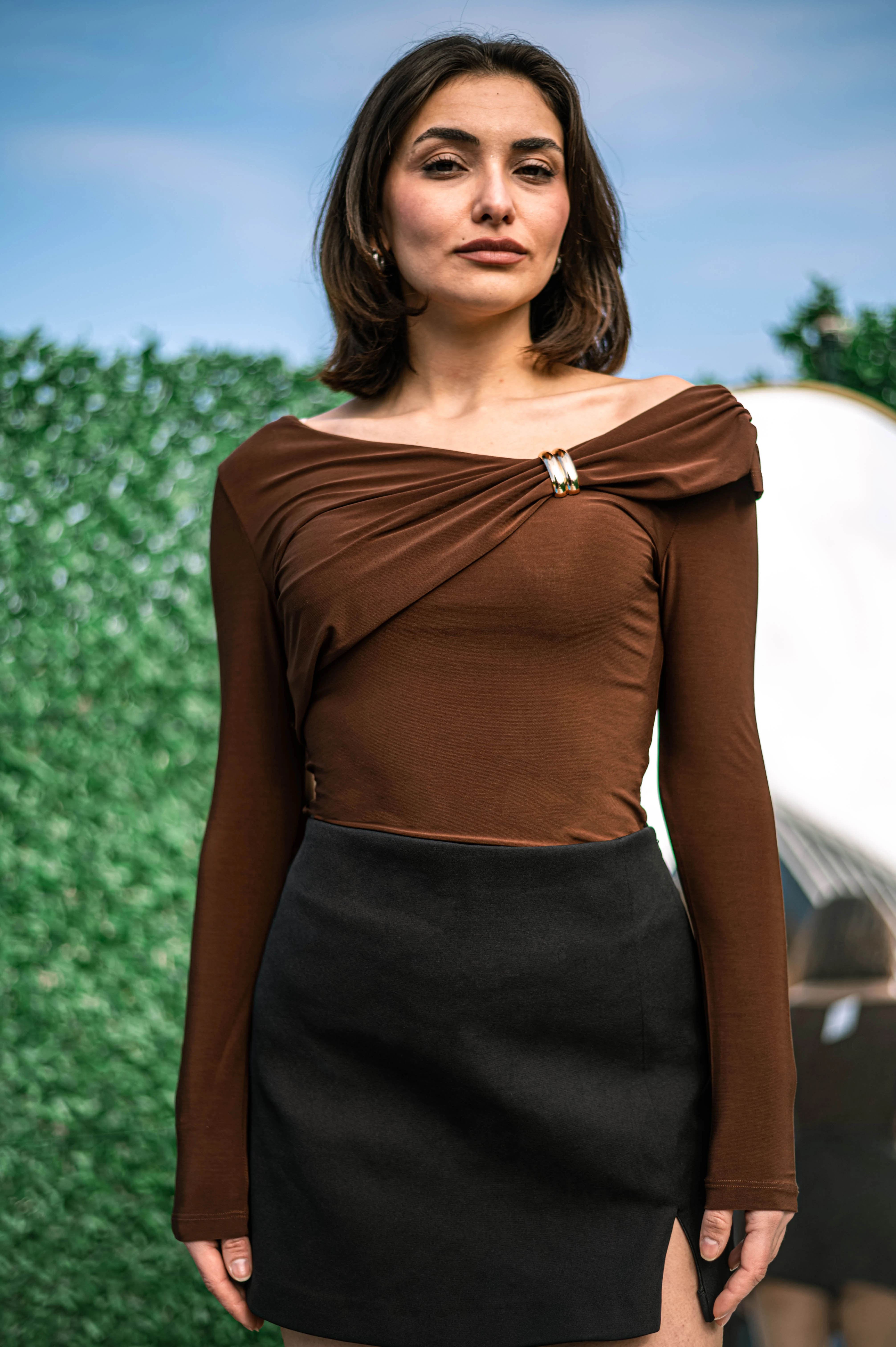 Kahverengi Yaka Aksesuar Detaylı Bluz