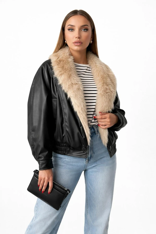 Siyah Yakası Kürklü Kruvaze Deri Ceket