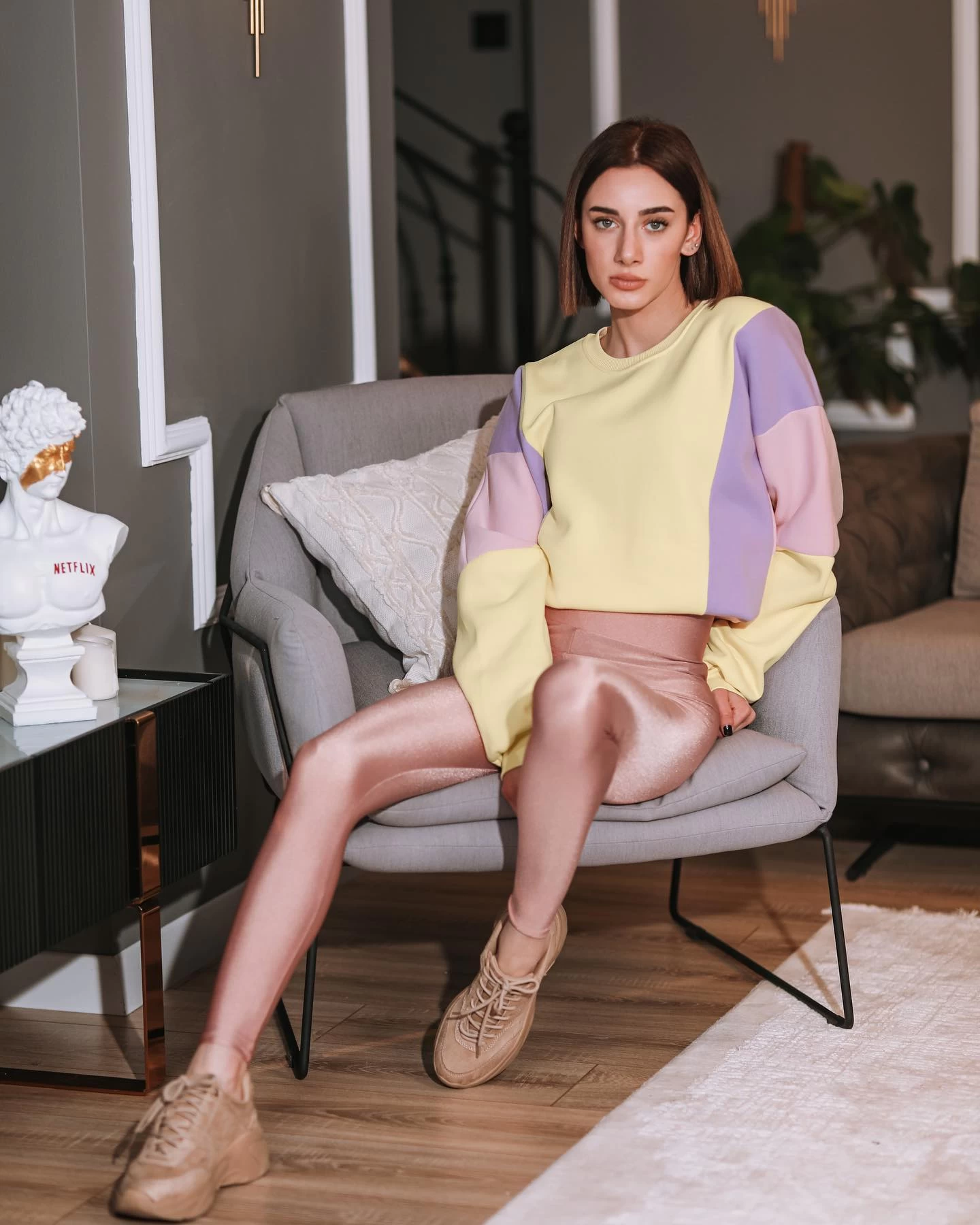Yanları Lila Renk Sweatshirt ve Yüksek Bel Parlak Disko Tayt